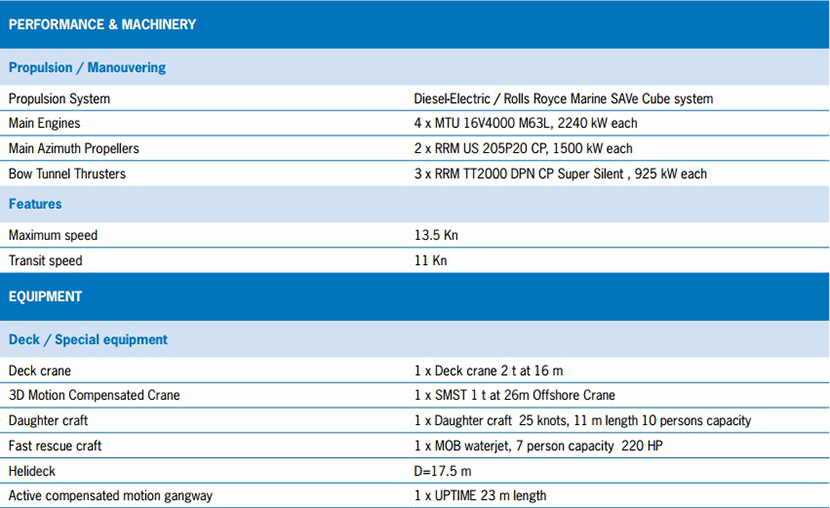 | 發(fā)動機(jī)功率: | 2240kW | 推進(jìn)裝置: | Diesel-Electric/Rolls Royce Marine SAVe Cube system |