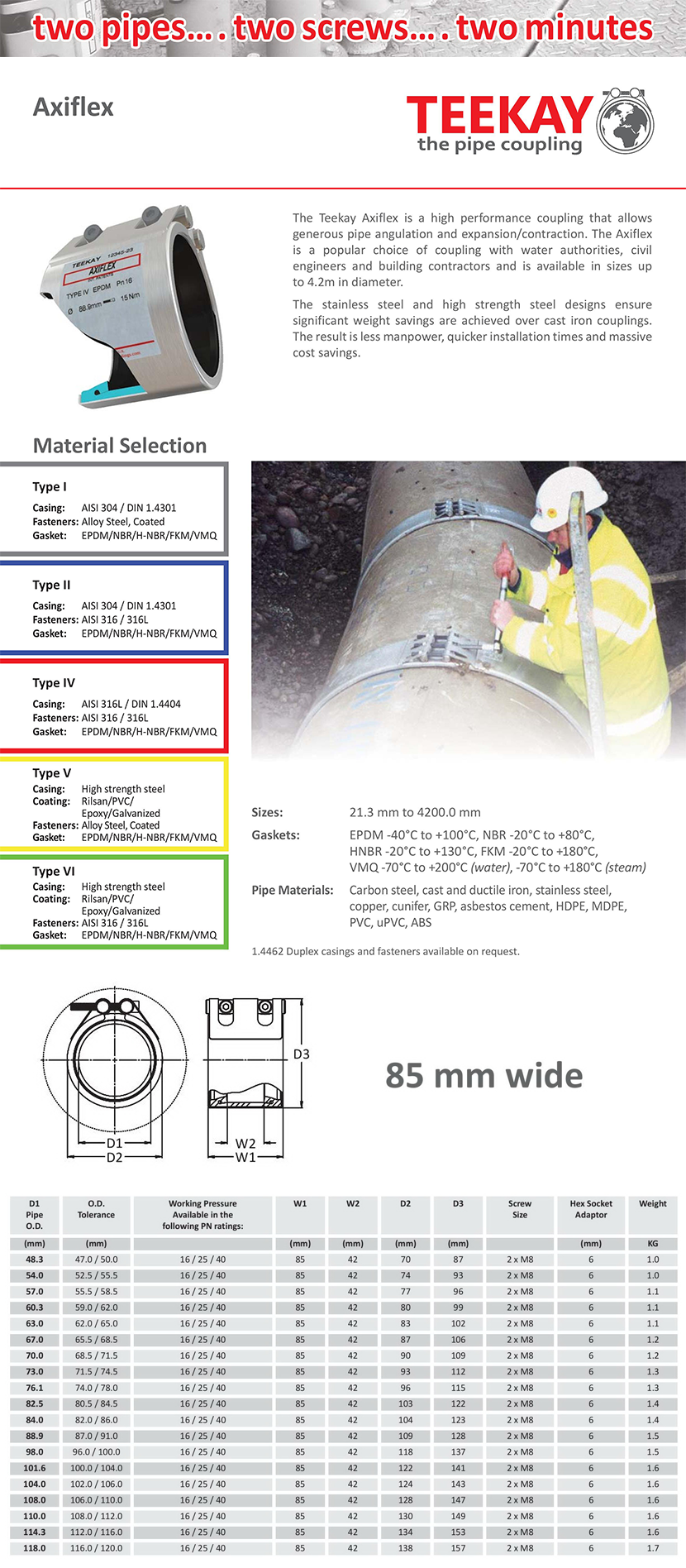 異徑最大差值: 非異徑 適用管道材質: Carbon steel, cast and ductile iron, stainless steel,copper, cunifer, GRP, asbestos cement, HDPE, MDPE,PVC, uPVC, ABS