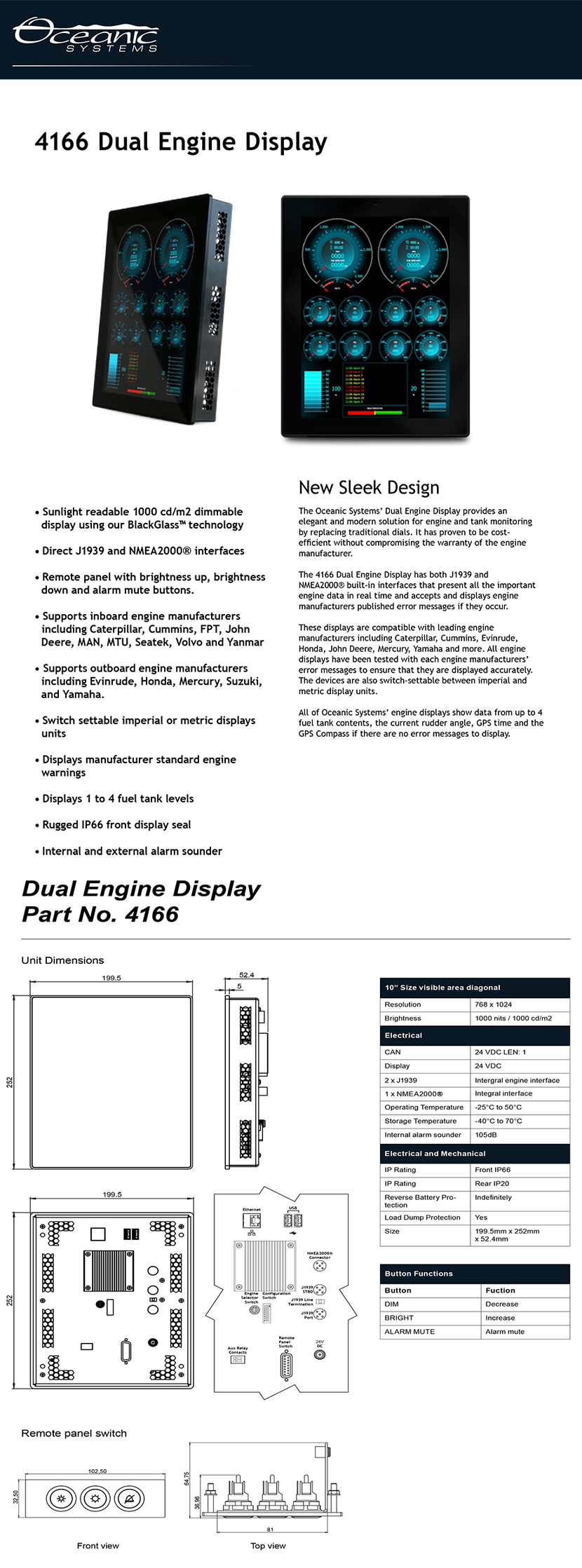 | 適配發(fā)動(dòng)機(jī)品牌: | 舷內(nèi)機(jī)- Caterpillar, Cummins, FPT, John Deere, MAN, MTU, Seatek, Volvo, Yanmar;舷外機(jī)- Evinrude, Honda, Mercury, Suzuki, Yamaha | 防護(hù)等級(jí): | IP66(Front)/ IP20(Rear) |