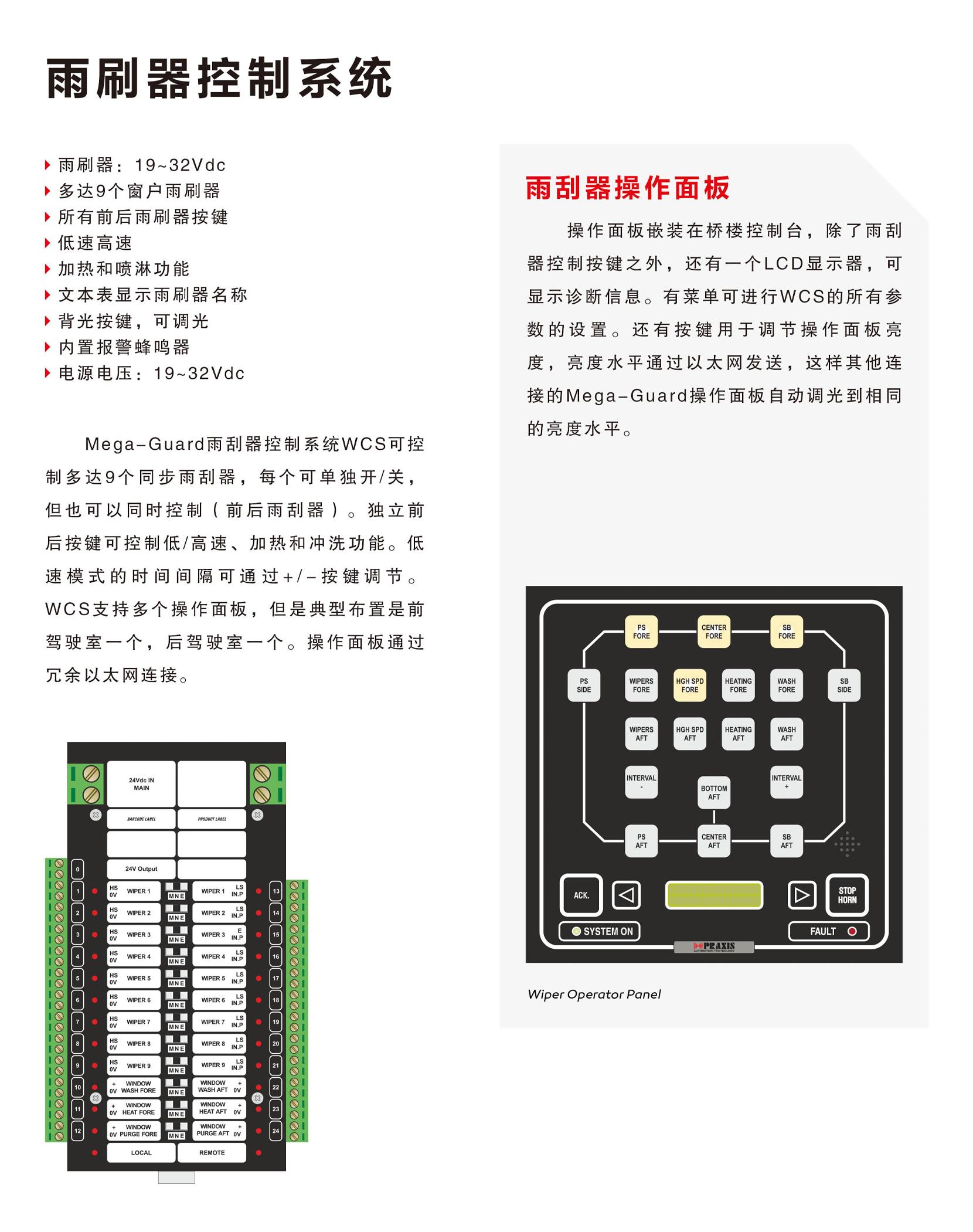 類型: 雨刷器控制 系統特點: 可控制多達9個同步雨刮器,每個可單獨開/ 關, 但也可以同時控制 (前后雨刮器);操作面板嵌裝在橋樓控制臺,可顯示診斷信息;可通過界面菜單進行所有參數的設置