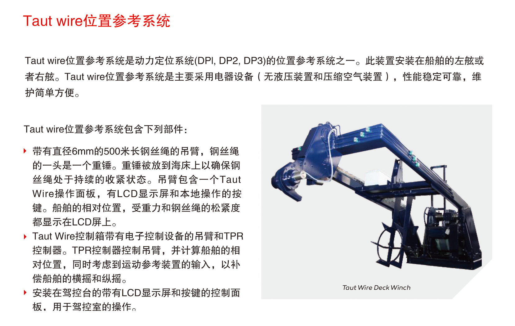 | 位置測量系統(tǒng)及傳感: | 張繩系統(tǒng)/全球差分定位系統(tǒng)/激光/雷達/聲學定位測量系統(tǒng)/陀螺羅經(jīng)/風傳感器/運動參考單元 | 性能亮點: | 為客戶量身定制高性價比“全級別動力定位系統(tǒng)解決方案”,滿足客戶施工作業(yè)的特殊要求;產(chǎn)品成熟、技術先進、應用廣泛,全球數(shù)百套應用業(yè)績,深得客戶好評與信賴;強大穩(wěn)定的系統(tǒng)性能可大幅度提升船舶的工作效率,為業(yè)主提供高精度、可靠、安全的作業(yè)保障;優(yōu)越的人性化操作界面,解決語言障礙,便于操控人員掌握;具備全研發(fā)、全生產(chǎn)線系統(tǒng);具備低耗能,低故障率特性;具備優(yōu)秀的擴展、兼容能力,具有實施一站式集成配套的能力,大幅度提高效率,降低成本 |